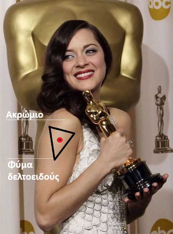 Λοιπόν, επί του δεξιού βραχίονος της καλλονής κυρίας Μαριόν Κοτιγιάρ, σημείωσα τη σωστή θέση στην οποία πρέπει να γίνονται τα εμβόλια ενηλίκων.